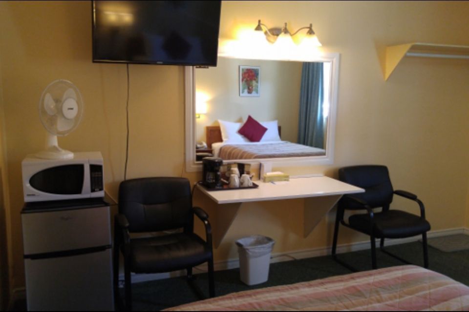 Queen Kitchenette Room – Enjoy the comfort of a cozy queen bed and the convenience of your own in-room kitchenette, complete with a two-burner cooktop, small sink, microwave, fridge, coffee maker, and table with chairs for dining or work. Relax with cable TV, charge your devices easily with bedside USB and auxiliary outlets, and refresh in a private 4-piece bathroom featuring a curved, hookless shower curtain for extra space. Perfect for longer stays or guests who enjoy cooking their own meals.