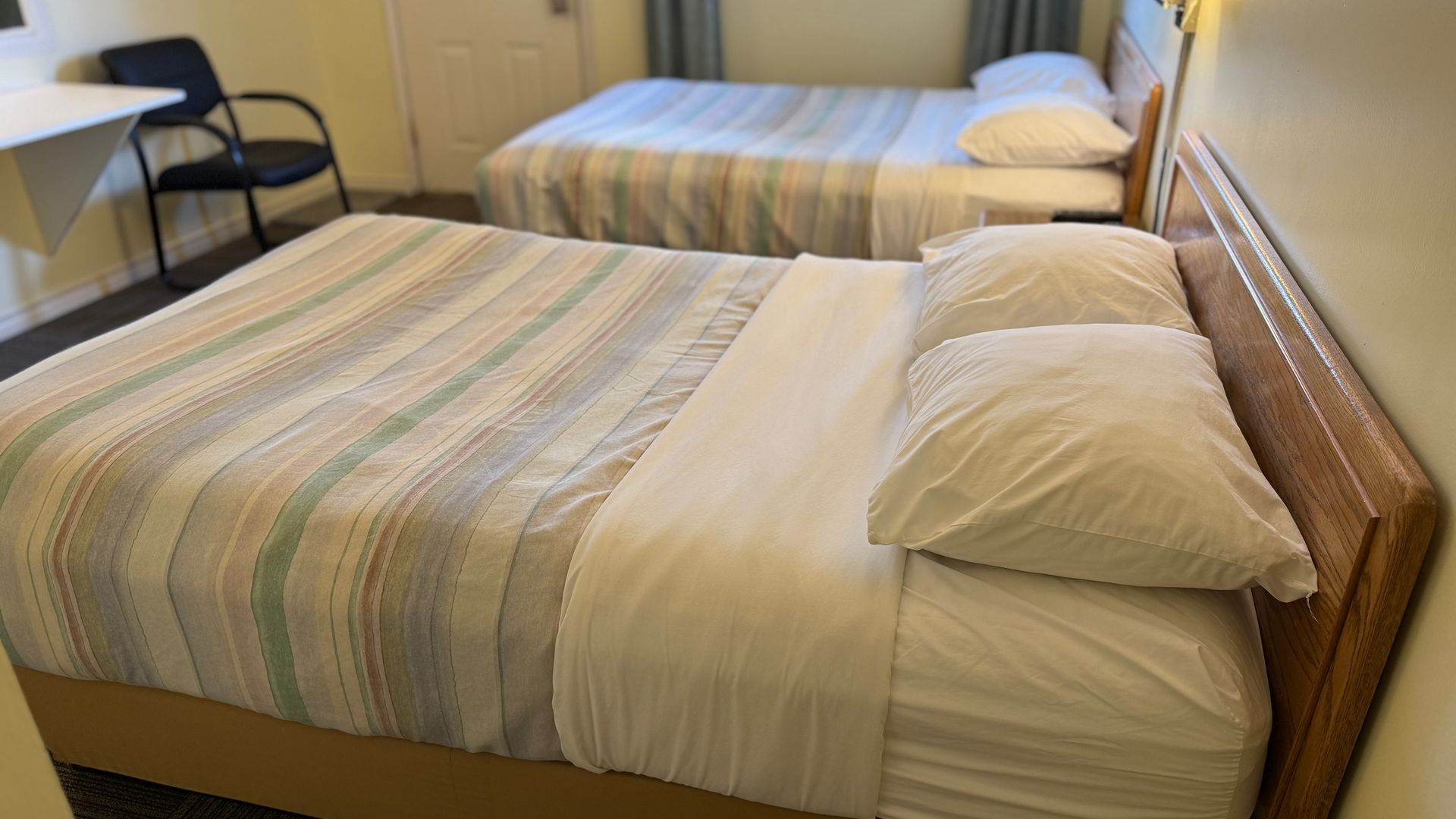 Double Room – Perfect for friends, families, or travel companions, this room offers two comfortable double beds and convenient in-room amenities including a fridge, microwave, and coffee maker. Enjoy your favorite shows on cable TV, keep devices powered with bedside USB and auxiliary outlets, and refresh in a private 4-piece bathroom with a spacious curved, hookless shower curtain.